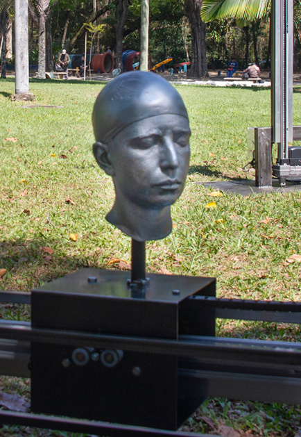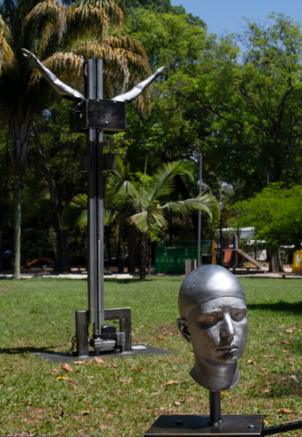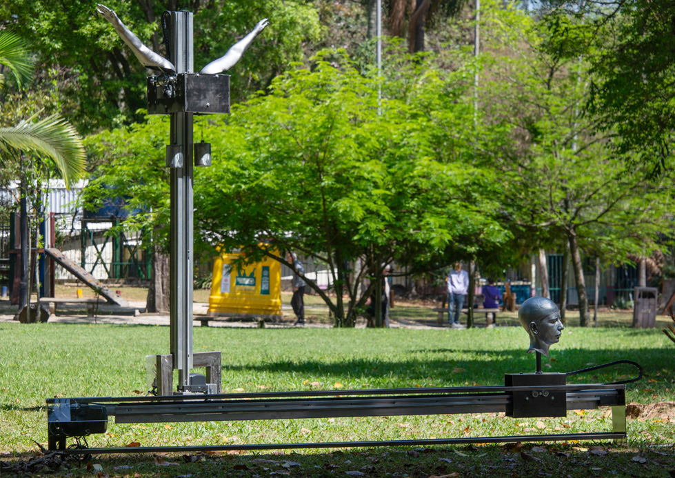 Materiais: Peças escultóricas moldadas diretamente do corpo e reproduzidas em fibra de vidro e resina, motores, eletrônicos, estruturas em ferro, metalon e alumínio.
