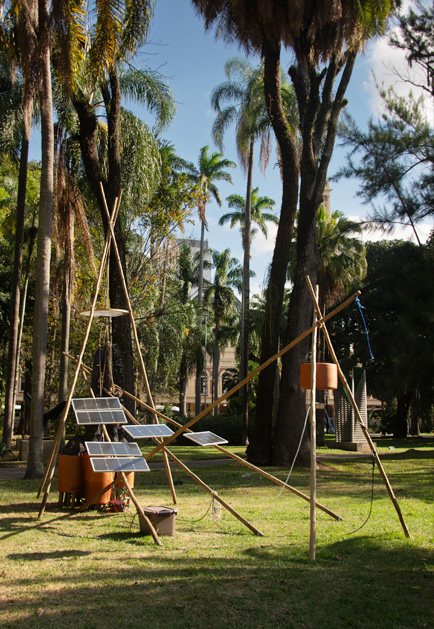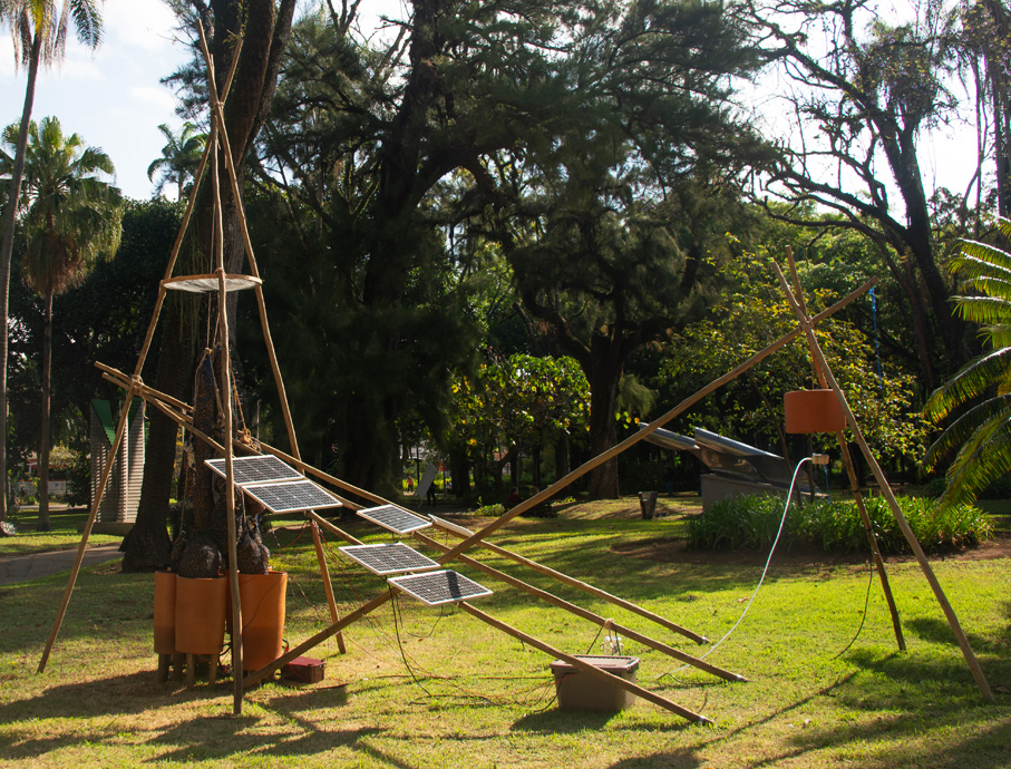 Um organismo criado com materiais naturais, como argila e carvão ativado, além de redes de pesca, capta a água da chuva, filtrando e devolvendo-a limpa ao meio ambiente. Esse sistema tão acessível quanto sofisticado faz parte de Neosymbiota Lucens – Unidade autônoma de despoluição  Tentativa 1: campo de Guaré, instalação criada por Lícida Vidal (1984, São Paulo). A obra destaca a interseção entre arte e tecnologia e a importância da sustentabilidade e do uso consciente dos recursos naturais.