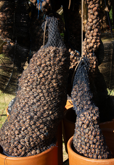 Materiais: Eucalipto, cerâmica, placa solar, bateria, bomba de água, sensor de nível, sensor de luz, arduino, servo motor, mangueira, pulverizador, pressostato, vela de filtro, fio de cobre, rede de pesca, samburá.